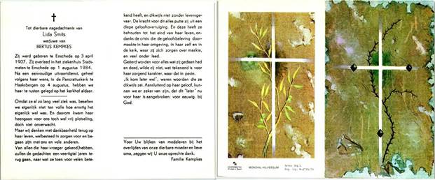 Op 1 augustus 1984 overlijdt Lida op 77 jarige leeftijd in het ziekenhuis Stadsmaten te Enschede. Ze ligt naast haar man Bertus begraven.